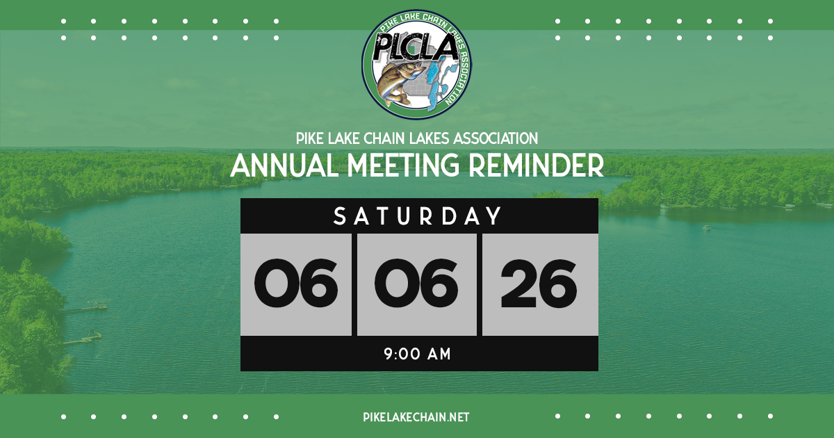 What:  PLCLA Annual Meeting Where:  Pike Lake Fire Station Meeting Room When:  Saturday, June 6th, 9:00 AM ­ The Annual meeting is open to the public with a dedicated agenda item for public comment. Agenda will be posted as soon as it's available.