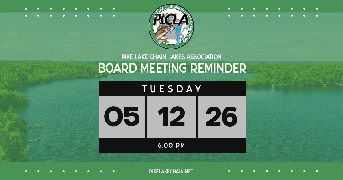 What:  PLCLA Board Meeting Where:  Pike Lake Fire Station Meeting Room When:  Tuesday, May 12th, 6:00 PM ­ The Annual meeting is open to the public with a dedicated agenda item for public comment. Agenda:  https://pikelakechain.net/newsletters-minutes/